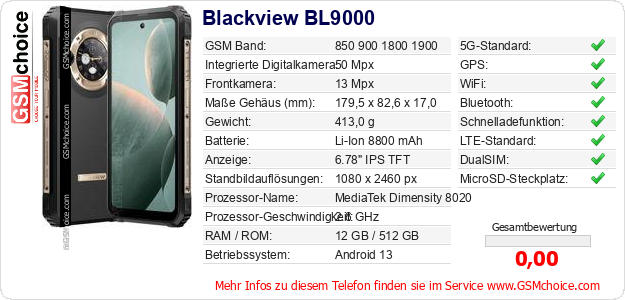 Hast du eigene Webseite? Willst du die Informationen über Standarddaten des Handys Blackview BL9000 irgendwo veröffentlichen? Das ist sehr einfach. Du kannst das Bild herunterladen oder kopieren und auf der Webseite folgenden Code hinzufügen:Das Einfügen von diesem Code verursacht das Anzeigen von dem folgenden Bild: