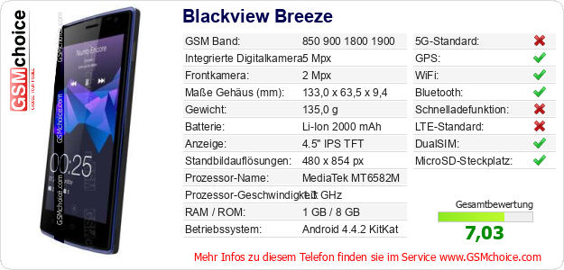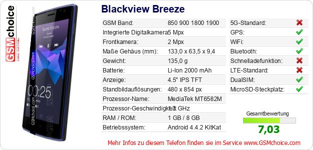 Hast du eigene Webseite? Willst du die Informationen über Standarddaten des Handys Blackview Breeze irgendwo veröffentlichen? Das ist sehr einfach. Du kannst das Bild herunterladen oder kopieren und auf der Webseite folgenden Code hinzufügen:Das Einfügen von diesem Code verursacht das Anzeigen von dem folgenden Bild: