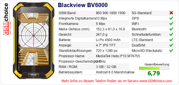 Hast du eigene Webseite? Willst du die Informationen über Standarddaten des Handys Blackview BV6000 irgendwo veröffentlichen? Das ist sehr einfach. Du kannst das Bild herunterladen oder kopieren und auf der Webseite folgenden Code hinzufügen:Das Einfügen von diesem Code verursacht das Anzeigen von dem folgenden Bild: