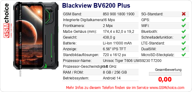 Daten des Mobiltelefons Blackview BV6200 Plus auf Ihrer Seite
