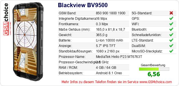 Hast du eigene Webseite? Willst du die Informationen über Standarddaten des Handys Blackview BV9500 irgendwo veröffentlichen? Das ist sehr einfach. Du kannst das Bild herunterladen oder kopieren und auf der Webseite folgenden Code hinzufügen:Das Einfügen von diesem Code verursacht das Anzeigen von dem folgenden Bild: