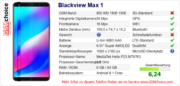 Hast du eigene Webseite? Willst du die Informationen über Standarddaten des Handys Blackview Max 1 irgendwo veröffentlichen? Das ist sehr einfach. Du kannst das Bild herunterladen oder kopieren und auf der Webseite folgenden Code hinzufügen:Das Einfügen von diesem Code verursacht das Anzeigen von dem folgenden Bild: