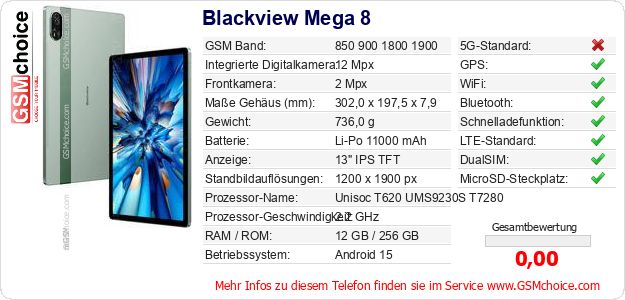 Hast du eigene Webseite? Willst du die Informationen über Standarddaten des Handys Blackview Mega 8 irgendwo veröffentlichen? Das ist sehr einfach. Du kannst das Bild herunterladen oder kopieren und auf der Webseite folgenden Code hinzufügen:Das Einfügen von diesem Code verursacht das Anzeigen von dem folgenden Bild: