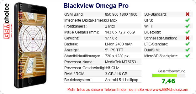 Hast du eigene Webseite? Willst du die Informationen über Standarddaten des Handys Blackview Omega Pro irgendwo veröffentlichen? Das ist sehr einfach. Du kannst das Bild herunterladen oder kopieren und auf der Webseite folgenden Code hinzufügen:Das Einfügen von diesem Code verursacht das Anzeigen von dem folgenden Bild: