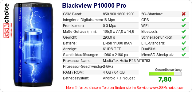 Hast du eigene Webseite? Willst du die Informationen über Standarddaten des Handys Blackview P10000 Pro irgendwo veröffentlichen? Das ist sehr einfach. Du kannst das Bild herunterladen oder kopieren und auf der Webseite folgenden Code hinzufügen:Das Einfügen von diesem Code verursacht das Anzeigen von dem folgenden Bild: