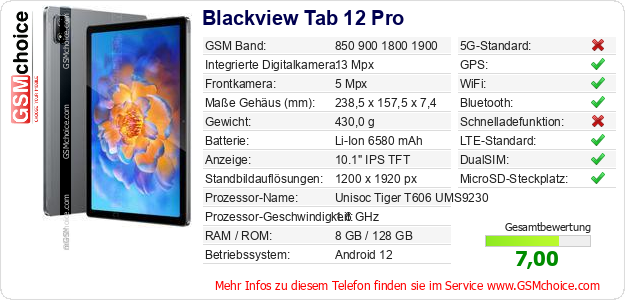 Hast du eigene Webseite? Willst du die Informationen über Standarddaten des Handys Blackview Tab 12 Pro irgendwo veröffentlichen? Das ist sehr einfach. Du kannst das Bild herunterladen oder kopieren und auf der Webseite folgenden Code hinzufügen:Das Einfügen von diesem Code verursacht das Anzeigen von dem folgenden Bild: