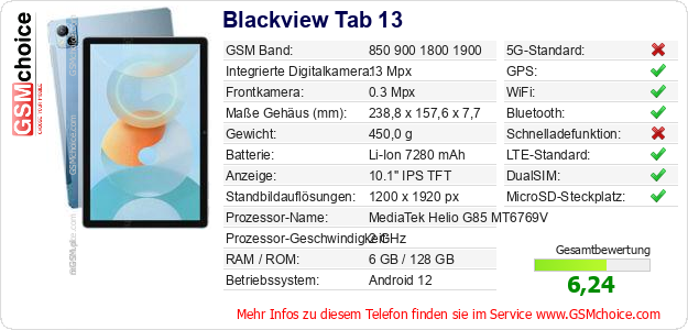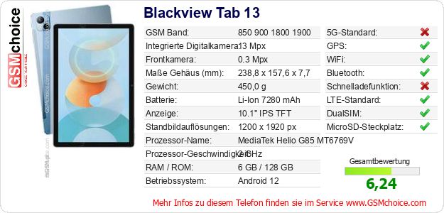 Hast du eigene Webseite? Willst du die Informationen über Standarddaten des Handys Blackview Tab 13 irgendwo veröffentlichen? Das ist sehr einfach. Du kannst das Bild herunterladen oder kopieren und auf der Webseite folgenden Code hinzufügen:Das Einfügen von diesem Code verursacht das Anzeigen von dem folgenden Bild: