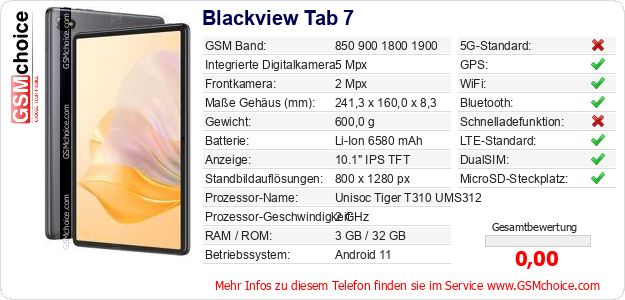 Hast du eigene Webseite? Willst du die Informationen über Standarddaten des Handys Blackview Tab 7 irgendwo veröffentlichen? Das ist sehr einfach. Du kannst das Bild herunterladen oder kopieren und auf der Webseite folgenden Code hinzufügen:Das Einfügen von diesem Code verursacht das Anzeigen von dem folgenden Bild: