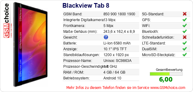 Hast du eigene Webseite? Willst du die Informationen über Standarddaten des Handys Blackview Tab 8 irgendwo veröffentlichen? Das ist sehr einfach. Du kannst das Bild herunterladen oder kopieren und auf der Webseite folgenden Code hinzufügen:Das Einfügen von diesem Code verursacht das Anzeigen von dem folgenden Bild:
