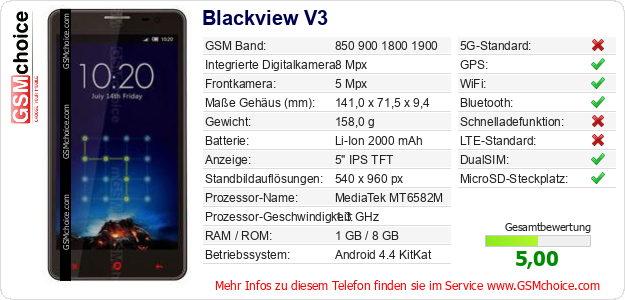 Hast du eigene Webseite? Willst du die Informationen über Standarddaten des Handys Blackview V3 irgendwo veröffentlichen? Das ist sehr einfach. Du kannst das Bild herunterladen oder kopieren und auf der Webseite folgenden Code hinzufügen:Das Einfügen von diesem Code verursacht das Anzeigen von dem folgenden Bild: