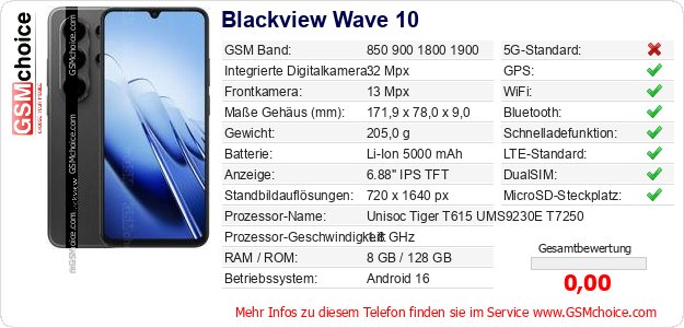Hast du eigene Webseite? Willst du die Informationen über Standarddaten des Handys Blackview Wave 10 irgendwo veröffentlichen? Das ist sehr einfach. Du kannst das Bild herunterladen oder kopieren und auf der Webseite folgenden Code hinzufügen:Das Einfügen von diesem Code verursacht das Anzeigen von dem folgenden Bild: