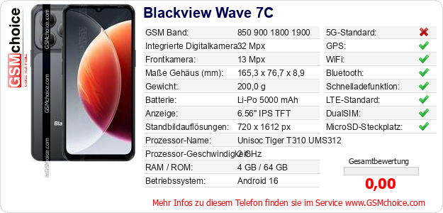 Hast du eigene Webseite? Willst du die Informationen über Standarddaten des Handys Blackview Wave 7C irgendwo veröffentlichen? Das ist sehr einfach. Du kannst das Bild herunterladen oder kopieren und auf der Webseite folgenden Code hinzufügen:Das Einfügen von diesem Code verursacht das Anzeigen von dem folgenden Bild: