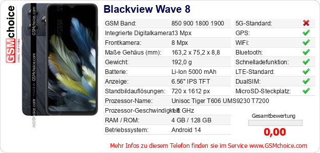 Hast du eigene Webseite? Willst du die Informationen über Standarddaten des Handys Blackview Wave 8 irgendwo veröffentlichen? Das ist sehr einfach. Du kannst das Bild herunterladen oder kopieren und auf der Webseite folgenden Code hinzufügen:Das Einfügen von diesem Code verursacht das Anzeigen von dem folgenden Bild: