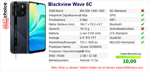 Daten des Mobiltelefons Blackview Wave 6C auf Ihrer Seite