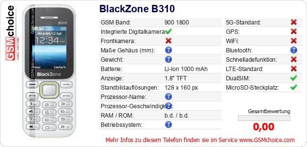 Hast du eigene Webseite? Willst du die Informationen über Standarddaten des Handys BlackZone B310 irgendwo veröffentlichen? Das ist sehr einfach. Du kannst das Bild herunterladen oder kopieren und auf der Webseite folgenden Code hinzufügen:Das Einfügen von diesem Code verursacht das Anzeigen von dem folgenden Bild: