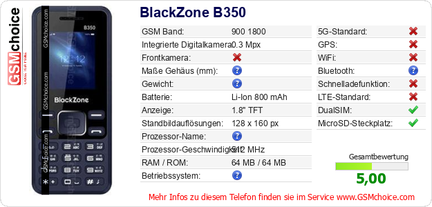 Hast du eigene Webseite? Willst du die Informationen über Standarddaten des Handys BlackZone B350 irgendwo veröffentlichen? Das ist sehr einfach. Du kannst das Bild herunterladen oder kopieren und auf der Webseite folgenden Code hinzufügen:Das Einfügen von diesem Code verursacht das Anzeigen von dem folgenden Bild: