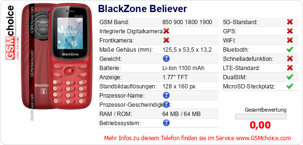 Hast du eigene Webseite? Willst du die Informationen über Standarddaten des Handys BlackZone Believer irgendwo veröffentlichen? Das ist sehr einfach. Du kannst das Bild herunterladen oder kopieren und auf der Webseite folgenden Code hinzufügen:Das Einfügen von diesem Code verursacht das Anzeigen von dem folgenden Bild: