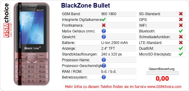 Hast du eigene Webseite? Willst du die Informationen über Standarddaten des Handys BlackZone Bullet irgendwo veröffentlichen? Das ist sehr einfach. Du kannst das Bild herunterladen oder kopieren und auf der Webseite folgenden Code hinzufügen:Das Einfügen von diesem Code verursacht das Anzeigen von dem folgenden Bild: