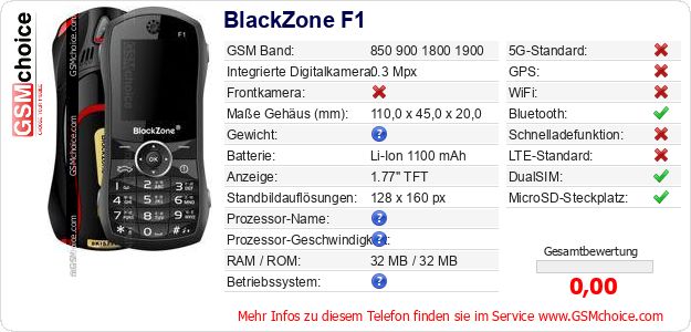 Hast du eigene Webseite? Willst du die Informationen über Standarddaten des Handys BlackZone F1 irgendwo veröffentlichen? Das ist sehr einfach. Du kannst das Bild herunterladen oder kopieren und auf der Webseite folgenden Code hinzufügen:Das Einfügen von diesem Code verursacht das Anzeigen von dem folgenden Bild: