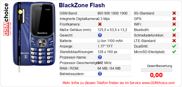 Hast du eigene Webseite? Willst du die Informationen über Standarddaten des Handys BlackZone Flash irgendwo veröffentlichen? Das ist sehr einfach. Du kannst das Bild herunterladen oder kopieren und auf der Webseite folgenden Code hinzufügen:Das Einfügen von diesem Code verursacht das Anzeigen von dem folgenden Bild: