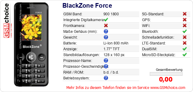 Hast du eigene Webseite? Willst du die Informationen über Standarddaten des Handys BlackZone Force irgendwo veröffentlichen? Das ist sehr einfach. Du kannst das Bild herunterladen oder kopieren und auf der Webseite folgenden Code hinzufügen:Das Einfügen von diesem Code verursacht das Anzeigen von dem folgenden Bild: