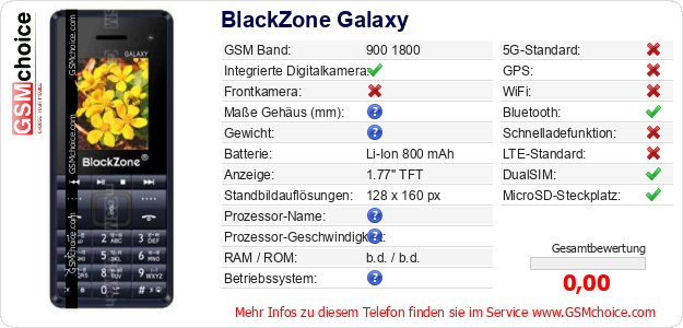 Hast du eigene Webseite? Willst du die Informationen über Standarddaten des Handys BlackZone Galaxy irgendwo veröffentlichen? Das ist sehr einfach. Du kannst das Bild herunterladen oder kopieren und auf der Webseite folgenden Code hinzufügen:Das Einfügen von diesem Code verursacht das Anzeigen von dem folgenden Bild:
