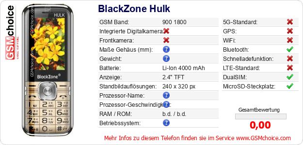 Hast du eigene Webseite? Willst du die Informationen über Standarddaten des Handys BlackZone Hulk irgendwo veröffentlichen? Das ist sehr einfach. Du kannst das Bild herunterladen oder kopieren und auf der Webseite folgenden Code hinzufügen:Das Einfügen von diesem Code verursacht das Anzeigen von dem folgenden Bild:
