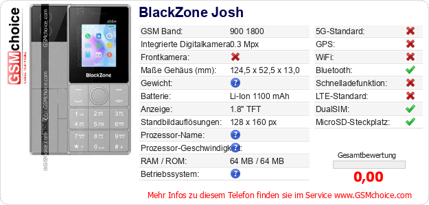 Hast du eigene Webseite? Willst du die Informationen über Standarddaten des Handys BlackZone Josh irgendwo veröffentlichen? Das ist sehr einfach. Du kannst das Bild herunterladen oder kopieren und auf der Webseite folgenden Code hinzufügen:Das Einfügen von diesem Code verursacht das Anzeigen von dem folgenden Bild:
