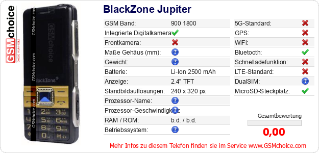 Hast du eigene Webseite? Willst du die Informationen über Standarddaten des Handys BlackZone Jupiter irgendwo veröffentlichen? Das ist sehr einfach. Du kannst das Bild herunterladen oder kopieren und auf der Webseite folgenden Code hinzufügen:Das Einfügen von diesem Code verursacht das Anzeigen von dem folgenden Bild: