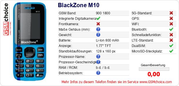 Hast du eigene Webseite? Willst du die Informationen über Standarddaten des Handys BlackZone M10 irgendwo veröffentlichen? Das ist sehr einfach. Du kannst das Bild herunterladen oder kopieren und auf der Webseite folgenden Code hinzufügen:Das Einfügen von diesem Code verursacht das Anzeigen von dem folgenden Bild: