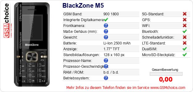 Hast du eigene Webseite? Willst du die Informationen über Standarddaten des Handys BlackZone M5 irgendwo veröffentlichen? Das ist sehr einfach. Du kannst das Bild herunterladen oder kopieren und auf der Webseite folgenden Code hinzufügen:Das Einfügen von diesem Code verursacht das Anzeigen von dem folgenden Bild: