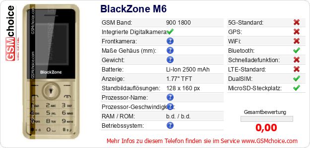 Hast du eigene Webseite? Willst du die Informationen über Standarddaten des Handys BlackZone M6 irgendwo veröffentlichen? Das ist sehr einfach. Du kannst das Bild herunterladen oder kopieren und auf der Webseite folgenden Code hinzufügen:Das Einfügen von diesem Code verursacht das Anzeigen von dem folgenden Bild:
