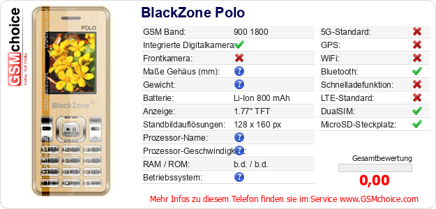Hast du eigene Webseite? Willst du die Informationen über Standarddaten des Handys BlackZone Polo irgendwo veröffentlichen? Das ist sehr einfach. Du kannst das Bild herunterladen oder kopieren und auf der Webseite folgenden Code hinzufügen:Das Einfügen von diesem Code verursacht das Anzeigen von dem folgenden Bild: