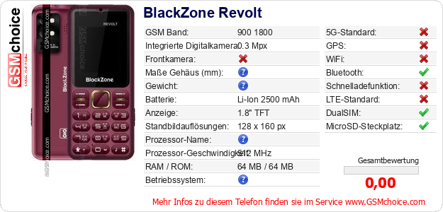 Hast du eigene Webseite? Willst du die Informationen über Standarddaten des Handys BlackZone Revolt irgendwo veröffentlichen? Das ist sehr einfach. Du kannst das Bild herunterladen oder kopieren und auf der Webseite folgenden Code hinzufügen:Das Einfügen von diesem Code verursacht das Anzeigen von dem folgenden Bild: