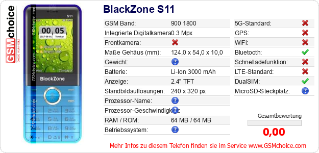 Hast du eigene Webseite? Willst du die Informationen über Standarddaten des Handys BlackZone S11 irgendwo veröffentlichen? Das ist sehr einfach. Du kannst das Bild herunterladen oder kopieren und auf der Webseite folgenden Code hinzufügen:Das Einfügen von diesem Code verursacht das Anzeigen von dem folgenden Bild: