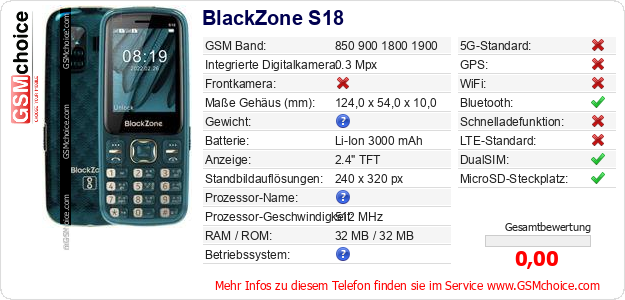 Hast du eigene Webseite? Willst du die Informationen über Standarddaten des Handys BlackZone S18 irgendwo veröffentlichen? Das ist sehr einfach. Du kannst das Bild herunterladen oder kopieren und auf der Webseite folgenden Code hinzufügen:Das Einfügen von diesem Code verursacht das Anzeigen von dem folgenden Bild: