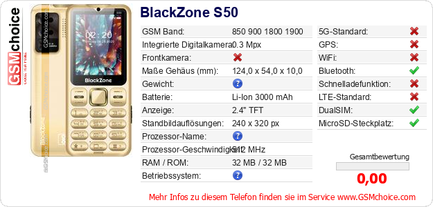 Hast du eigene Webseite? Willst du die Informationen über Standarddaten des Handys BlackZone S50 irgendwo veröffentlichen? Das ist sehr einfach. Du kannst das Bild herunterladen oder kopieren und auf der Webseite folgenden Code hinzufügen:Das Einfügen von diesem Code verursacht das Anzeigen von dem folgenden Bild: