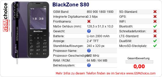 Hast du eigene Webseite? Willst du die Informationen über Standarddaten des Handys BlackZone S80 irgendwo veröffentlichen? Das ist sehr einfach. Du kannst das Bild herunterladen oder kopieren und auf der Webseite folgenden Code hinzufügen:Das Einfügen von diesem Code verursacht das Anzeigen von dem folgenden Bild: