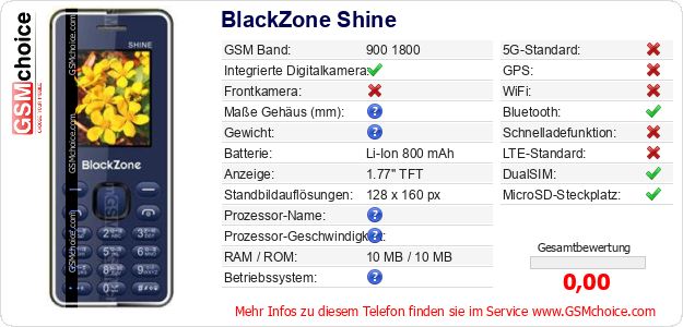 Hast du eigene Webseite? Willst du die Informationen über Standarddaten des Handys BlackZone Shine irgendwo veröffentlichen? Das ist sehr einfach. Du kannst das Bild herunterladen oder kopieren und auf der Webseite folgenden Code hinzufügen:Das Einfügen von diesem Code verursacht das Anzeigen von dem folgenden Bild:
