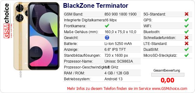 Hast du eigene Webseite? Willst du die Informationen über Standarddaten des Handys BlackZone Terminator irgendwo veröffentlichen? Das ist sehr einfach. Du kannst das Bild herunterladen oder kopieren und auf der Webseite folgenden Code hinzufügen:Das Einfügen von diesem Code verursacht das Anzeigen von dem folgenden Bild: