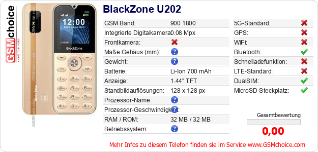 Hast du eigene Webseite? Willst du die Informationen über Standarddaten des Handys BlackZone U202 irgendwo veröffentlichen? Das ist sehr einfach. Du kannst das Bild herunterladen oder kopieren und auf der Webseite folgenden Code hinzufügen:Das Einfügen von diesem Code verursacht das Anzeigen von dem folgenden Bild: