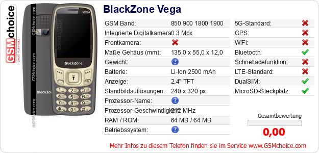Hast du eigene Webseite? Willst du die Informationen über Standarddaten des Handys BlackZone Vega irgendwo veröffentlichen? Das ist sehr einfach. Du kannst das Bild herunterladen oder kopieren und auf der Webseite folgenden Code hinzufügen:Das Einfügen von diesem Code verursacht das Anzeigen von dem folgenden Bild: