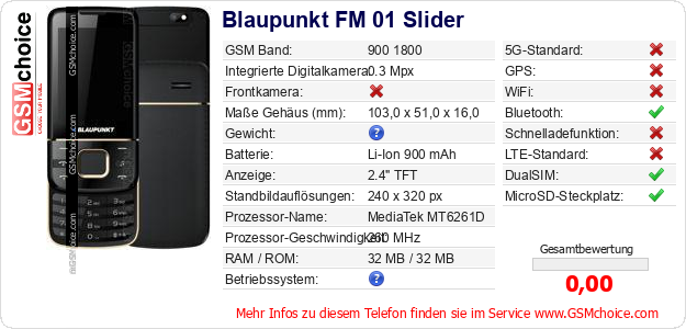 Hast du eigene Webseite? Willst du die Informationen über Standarddaten des Handys Blaupunkt FM 01 Slider irgendwo veröffentlichen? Das ist sehr einfach. Du kannst das Bild herunterladen oder kopieren und auf der Webseite folgenden Code hinzufügen:Das Einfügen von diesem Code verursacht das Anzeigen von dem folgenden Bild: