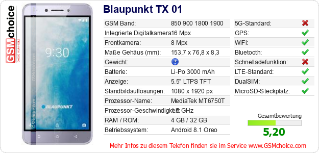 Daten des Mobiltelefons Blaupunkt TX 01 auf Ihrer Seite