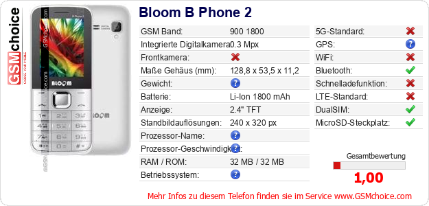 Hast du eigene Webseite? Willst du die Informationen über Standarddaten des Handys Bloom B Phone 2 irgendwo veröffentlichen? Das ist sehr einfach. Du kannst das Bild herunterladen oder kopieren und auf der Webseite folgenden Code hinzufügen:Das Einfügen von diesem Code verursacht das Anzeigen von dem folgenden Bild: