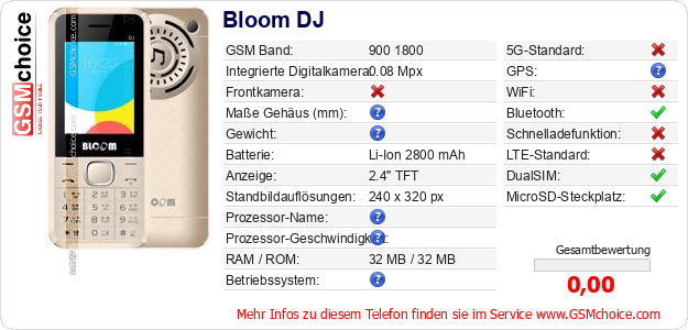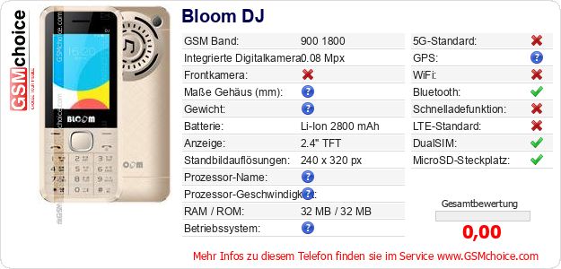 Hast du eigene Webseite? Willst du die Informationen über Standarddaten des Handys Bloom DJ irgendwo veröffentlichen? Das ist sehr einfach. Du kannst das Bild herunterladen oder kopieren und auf der Webseite folgenden Code hinzufügen:Das Einfügen von diesem Code verursacht das Anzeigen von dem folgenden Bild: