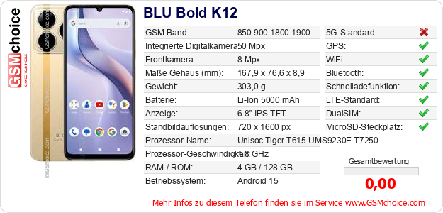 Hast du eigene Webseite? Willst du die Informationen über Standarddaten des Handys BLU Bold K12 irgendwo veröffentlichen? Das ist sehr einfach. Du kannst das Bild herunterladen oder kopieren und auf der Webseite folgenden Code hinzufügen:Das Einfügen von diesem Code verursacht das Anzeigen von dem folgenden Bild: