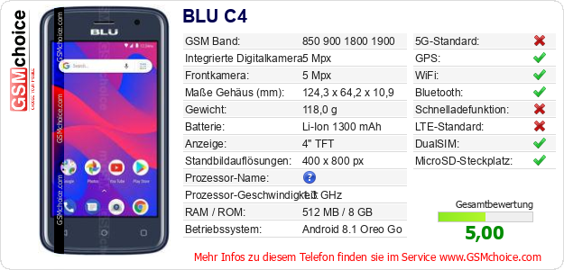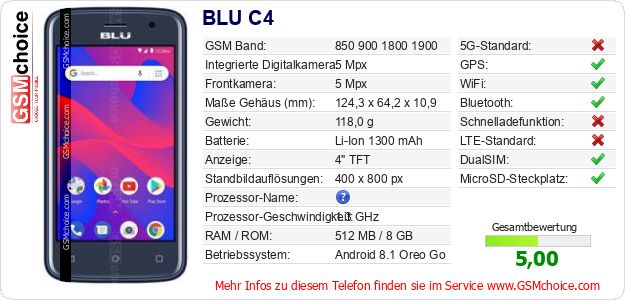 Hast du eigene Webseite? Willst du die Informationen über Standarddaten des Handys BLU C4 irgendwo veröffentlichen? Das ist sehr einfach. Du kannst das Bild herunterladen oder kopieren und auf der Webseite folgenden Code hinzufügen:Das Einfügen von diesem Code verursacht das Anzeigen von dem folgenden Bild: