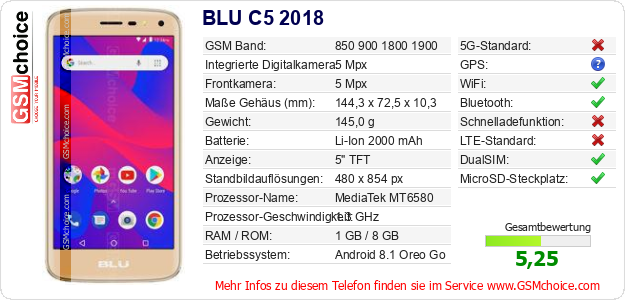 Hast du eigene Webseite? Willst du die Informationen über Standarddaten des Handys BLU C5 2018 irgendwo veröffentlichen? Das ist sehr einfach. Du kannst das Bild herunterladen oder kopieren und auf der Webseite folgenden Code hinzufügen:Das Einfügen von diesem Code verursacht das Anzeigen von dem folgenden Bild: