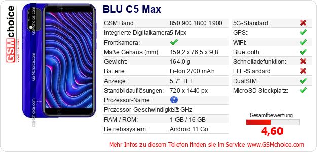 Hast du eigene Webseite? Willst du die Informationen über Standarddaten des Handys BLU C5 Max irgendwo veröffentlichen? Das ist sehr einfach. Du kannst das Bild herunterladen oder kopieren und auf der Webseite folgenden Code hinzufügen:Das Einfügen von diesem Code verursacht das Anzeigen von dem folgenden Bild: